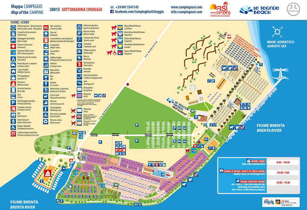 Kemping Oasi, egy tágas és felszerelt privát strand, és az összes kényelem. Egy bár, egy szendvicsbolt, egy étterem, strandröplabda bíróságok, teniszpályák és ötirányú futballpályák. Úszás medencék és egy hajó dokk a moor.
