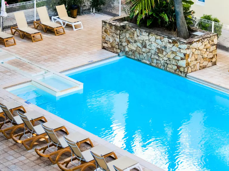 - Medence : fűtött úszómedence a lakóhelyen. Nyitási dátumok: az úszómedence: áprilistól október közepéig; a játékos medence: áprilistól október közepéig. Megjegyzés: Egy úszómedence és egy teraszmedence forró kádokkal, geyserrel és vízesésekkel - Méretek: 5 m x 15 m (mélység: 1,90 m maximális) - Napágyak és parazsolák elérhetőek, elérhetőségük alapján